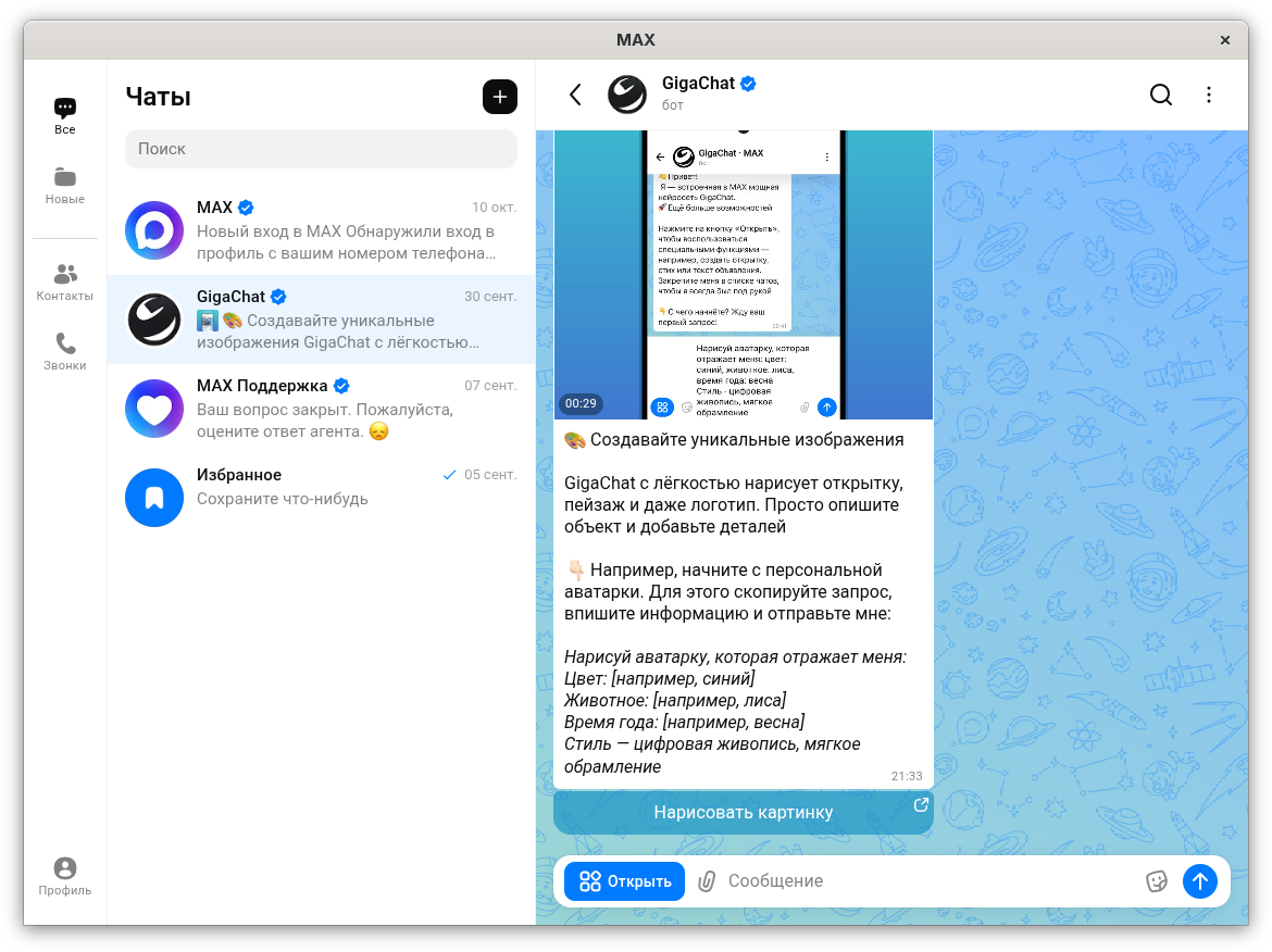 MAX — это быстрое и лёгкое приложение для обмена сообщениями, которое работает на любых устройствах — смартфонах и компьютерах. В него также встроена платформа мини-приложений, конструкторы чат-ботов и платежная система.